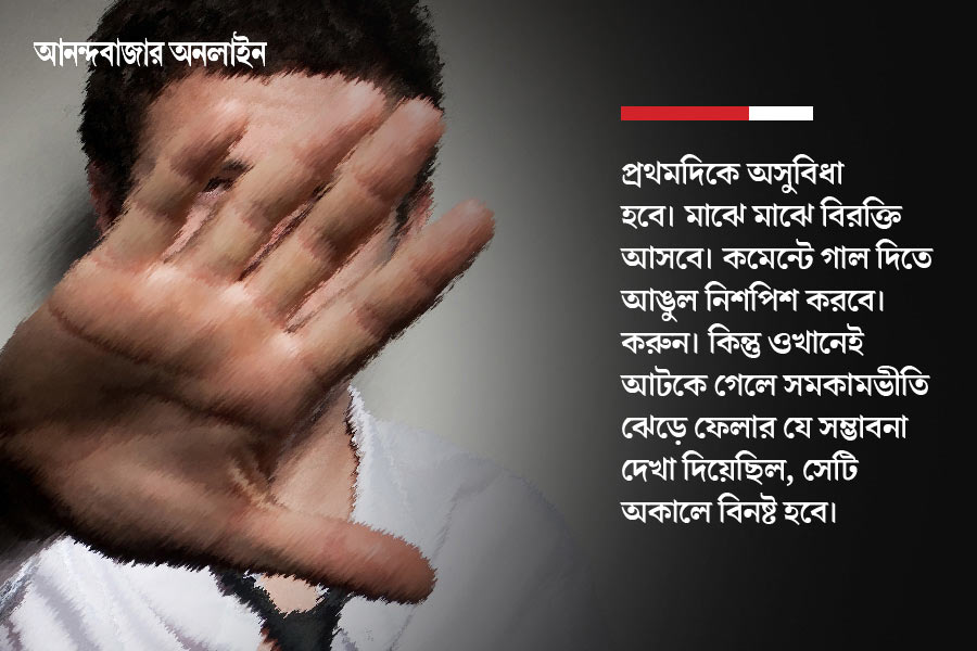 এই অবধি পড়েই খুব কঠিন মনে হলে কিংবা আমার পিণ্ডি চটকাতে ইচ্ছে হলে থামুন। বাকি পথের জন্য আপনি এখনও প্রস্তুত নন। গোটা জীবন পড়ে আছে। ধীরে ধীরে শিখবেন। যাঁরা এত অবধি পড়ে তেমন বিচলিত হলেন না, যাঁদের নিজেকে বদলানোর সাহস মনের মধ্যে ইতিমধ্যেই উঁকি দিচ্ছে, এই লেখার বাকি অংশটি তাঁদের জন্য। প্রথমদিকে অসুবিধা হবে। মাঝে মাঝে বিরক্তি আসবে। কমেন্টে গাল দিতে আঙুল নিশপিশ করবে। করুন। কিন্তু ওখানেই আটকে গেলে সমকামভীতি ঝেড়ে ফেলার যে সম্ভাবনা দেখা দিয়েছিল, সেটি অকালে বিনষ্ট হবে।