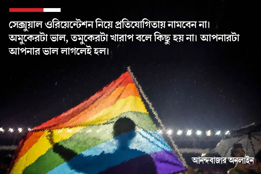 • সেক্সুয়াল ওরিয়েন্টেশন নিয়ে প্রতিযোগিতায় নামবেন না। অমুকেরটা ভাল, তমুকেরটা খারাপ বলে কিছু হয় না। আপনারটা আপনার ভাল লাগলেই হল।