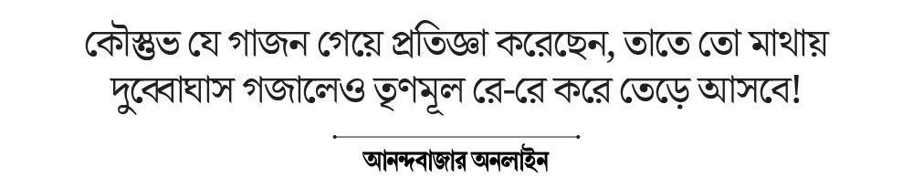 বয়সে নবীন কৌস্তুভের কি এ সবেই মাথাটা ঘুরে গেল? এতটাই যে, আদালত চত্বরেই নাপিত ডাকিয়ে বসলেন! সেটা তা-ও ঠিক ছিল। সঙ্গে ভীষ্মের প্রতিজ্ঞা করে ফেললেন, মমতাকে বাংলা থেকে উৎখাত না-করা পর্যন্ত মাথায় চুল রাখবেন না!