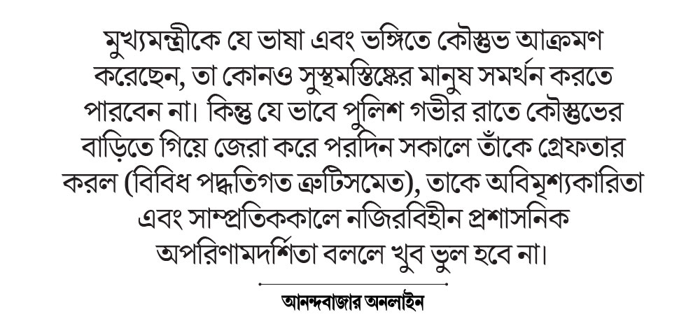 সম্ভবত সেই কারণেই তাঁর সেই বহুচর্চিত সাংবাদিক বৈঠকটিও ডাকা। সেখানে রাজ্যের মহিলা মুখ্যমন্ত্রীকে যে ভাষা এবং ভঙ্গিতে কৌস্তুভ আক্রমণ করেছেন, তা কোনও সুস্থমস্তিষ্কের মানুষ সমর্থন করতে পারবেন না। কিন্তু যে ভাবে পুলিশ গভীর রাতে কৌস্তুভের বাড়িতে গিয়ে জেরা করে পরদিন সকালে তাঁকে গ্রেফতার করল (বিবিধ পদ্ধতিগত ত্রুটিসমেত), তাকে অবিমৃশ্যকারিতা এবং সাম্প্রতিক কালে নজিরবিহীন প্রশাসনিক অপরিণামদর্শিতা বললে খুব ভুল হবে না।