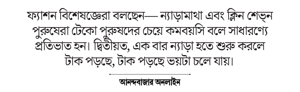 ফ্যাশন বিশেষজ্ঞেরা বলছেন— ১. ন্যাড়ামাথা এবং ক্লিন শেভ্ন পুরুষেরা টেকো পুরুষদের চেয়ে কমবয়সি বলে সাধারণ্যে প্রতিভাত হন। ন্যাড়ামাথা এবং গোঁফ-দাড়ি কামানো ‘লুক’ তাঁদের বয়স অন্তত দশ বছর কমিয়ে দেয়। দ্বিতীয়ত, এক বার ন্যাড়া হতে শুরু করলে টাক পড়ছে, টাক পড়ছে ভয়টা চলে যায়। স্নান করার সময়ে সময় কম লাগে। চুলের যত্ন নেওয়ার জন্য যে অঢেল সময় ব্যয় করতে হয়, সেটাও লাগে না। তেল বা শ্যাম্পুরও বালাই নেই। কত সাশ্রয়!
