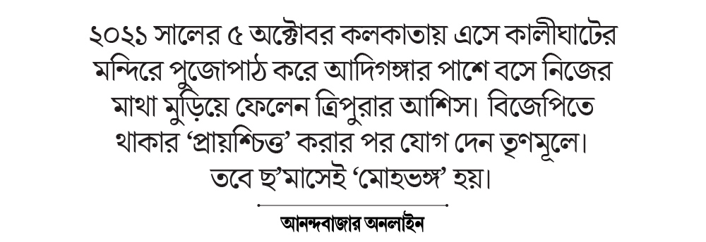 মাথা মুড়িয়েছিলেন ত্রিপুরার বিজেপি বিধায়ক আশিস দাস। তৃণমূল বাংলায় টানা তৃতীয় বার ক্ষমতায় আসার পর আশিস প্রথমে ঘোষণা করেন, মা কালীর মন্দিরে পুজো দিয়ে নিজের রাজনৈতিক জীবনের ‘বড় সিদ্ধান্ত’ নেবেন। তার পরেই তাঁর তৃণমূলে যোগদানের জল্পনা শুরু হয়েছিল। ২০২১ সালের ৫ অক্টোবর কলকাতায় এসে কালীঘাটের মন্দিরে পুজোপাঠ করে আদিগঙ্গার পাশে বসে নিজের মাথা মুড়িয়ে ফেলেন আশিস। বিজেপিতে থাকার ‘প্রায়শ্চিত্ত’ করার পর যোগ দেন তৃণমূলে। তবে ছ’মাসেই ‘মোহভঙ্গ’ হয় আশিসের। ২০২২ সালের ২৭ মে সাংবাদিক বৈঠক করে তৃণমূল ছাড়েন আশিস। তখন তাঁর মাথায় প্রায় আলুলায়িত কেশরাশি। যতদূর জানি, আশিস আর ন্যাড়া হননি।