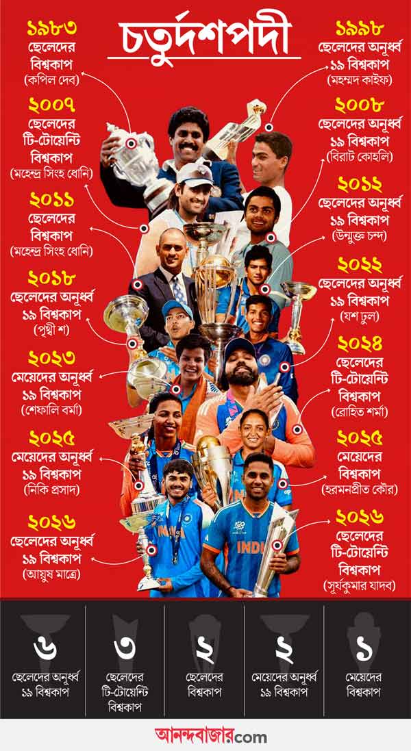 ছাপার ভুল নয়, সত্যি সত্যি। এখনও পর্যন্ত ১৪টি ক্রিকেট বিশ্বকাপ জিতেছে ভারত। ১৯৮৩ সালে কপিলদেবের লর্ডসে বিশ্বকাপ জয় প্রথমটা। চতুর্দশতমটি ঘটল রবিবার রাতে আমদাবাদে। এটা স্বাভাবিক যে, এর মধ্যে সবক’টা আমাদের মনে নেই। আমরা অনেক বেশি ব্যস্ত এবং উদ্বেল থাকি বড়দের বিশ্বকাপ অভিযান এবং তাঁদের হারজিত নিয়ে। যুব বিশ্বকাপ-টাপের খবর কে-ই বা রাখে। আমরা সেগুলোকে হরিজনসুলভ অনাগ্রহে খানিকটা দূরেই সরিয়ে রাখি। ভুলে যাই, যুব বিশ্বকাপের আঙিনা থেকেই বিরাট কোহলি-রবীন্দ্র জাডেজাদের প্রাথমিক উত্থান। পরের দিকে যাঁরা বৈগ্রহিক ক্রিকেটার হয়েছেন এবং এমন সব কীর্তিসৌধ গড়েছেন, যা ক্রিকেটীয় লোকগাথায় ঢুকে গিয়েছে। কিন্তু ‘সাপ্লাই লাইন’ থেকেছে সেই যুব বিশ্বকাপ। পরে যার জায়গা নিয়ে নিয়েছে আইপিএল। আমরা কি সে ভাবে মহিলা বিশ্বকাপের খবরও রাখতাম? বা মহিলা যুব বিশ্বকাপ? নাহ্, মহিলা ক্রিকেটের খবর-টবরই রাখতাম না। হালে রাখছি। রাখছে সারা দেশ। কারণ, খেলার দুনিয়ায় সাফল্যের নিরিখে এখন ওই ক্রিকেটটাই আছে আমাদের। সে পুরুষ হোক বা মহিলা। বড়দের ক্রিকেট হোক বা ছোটদের।