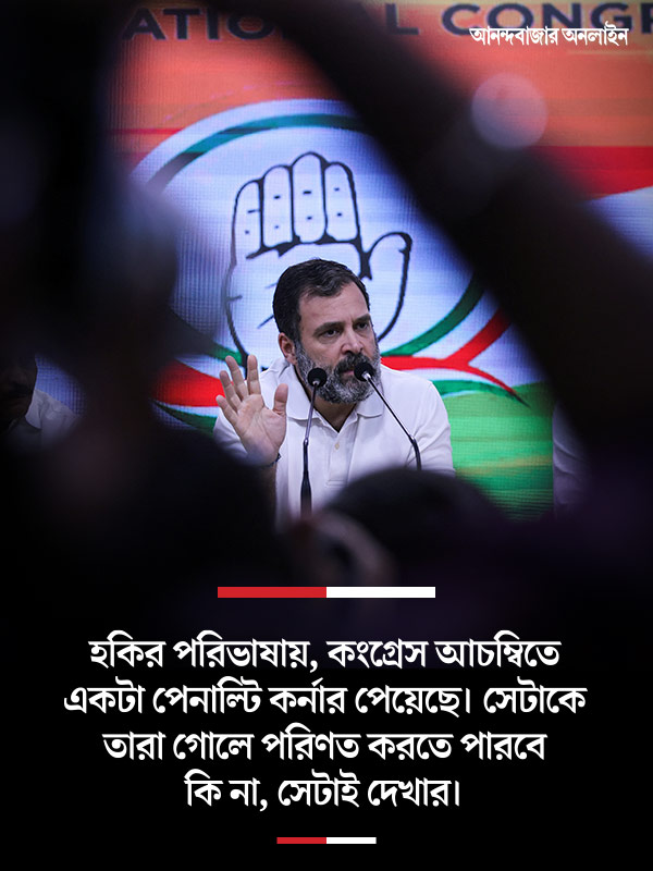 সেলুলয়েডে ‘চক দে ইন্ডিয়া’ ছাড়া হকি নিয়ে এখন এই উপমহাদেশে আর ততটা রোমান্টিসিজ়ম এবং আগ্রহ নেই। বহু দিন আগেই তার জায়গা নিয়ে নিয়েছে ক্রিকেট। কিন্তু রাহুলকাণ্ড এবং কংগ্রেসকে ব্যাখ্যা করতে গেলে সেই হকির মাঠেই যেতে হচ্ছে। হকির পরিভাষায়, কংগ্রেস আচম্বিতে একটা পেনাল্টি কর্নার পেয়েছে। সেটাকে তারা গোলে পরিণত করতে পারবে কি না, সেটাই দেখার।