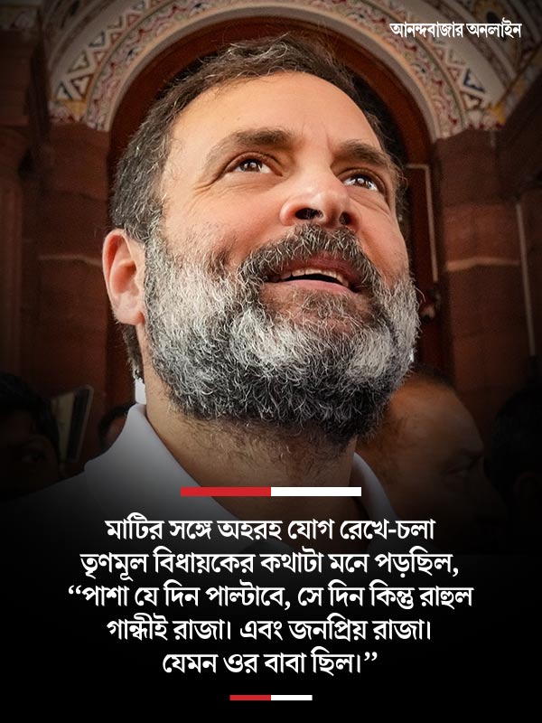 মাটির সঙ্গে অহরহ যোগ রেখে-চলা তৃণমূল বিধায়কের কথাটা মনে পড়ছিল, ‘‘পাশা যে দিন পাল্টাবে, সে দিন কিন্তু রাহুল গান্ধীই রাজা। এবং জনপ্রিয় রাজা। যেমন ওর বাবা ছিল।’’