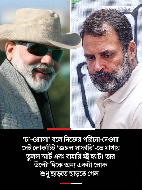 একই রকম অভাবনীয় ছিল নরেন্দ্র মোদীর সাপেক্ষে রাহুলের ক্রমশ পাল্টে পাল্টে যাওয়া। ফ্ল্যাশব্যাকে দেখলে মনে হয়, একটা লোক একটা সময়ে গান্ধী পরিবারকে আক্রমণ করে বলেছিল, ‘নামদার’ নয়, ‘কামদার’ চাই। সেই লোকটাই বলেছিল স্যুট-বুটের সরকার চাই না। ঝোলা-কাঁধে ফকির চাই। কারণ, সে এমন একটা সময়ে ক্ষমতায় আসার বাজি ধরেছিল, যখন কংগ্রেস-শাসিত দেশ দুর্নীতির পাঁকে নিমজ্জিত। সেই লোকটির যুদ্ধ ছিল একটি পরিবারের কায়েমি ভোগবাদের বিরুদ্ধে। সারা দেশ তাকে সাদরে আলিঙ্গন করেছিল। কিন্তু ‘চা-ওয়ালা’ বলে নিজের পরিচয়-দেওয়া সেই লোকটিই দিনেকালে পিন-স্ট্রাইপ্ড স্যুটে সোনার আখরে নিজের নাম খোদাই করাল। নিজস্বী তোলায় দড় হয়ে উঠল। ‘জঙ্গল সাফারি’-তে মাথায় তুলল স্মার্ট এবং বাহারি স্ট্র হ্যাট। তার চোখে উঠল ব্র্যান্ডেড রোদচশমা। কোন অ্যাঙ্গল থেকে ছবি উঠলে তাকে সর্বোত্তম দেখায়, তা নিয়ে ভয়ঙ্কর রকমের সচেতনতা তৈরি হল তার মধ্যে। হাফ-হাতা কুর্তা ছেড়ে কব্জি পর্যন্ত ফুলস্লিভ লম্বাঝুলের কুর্তা পরা শুরু করল। তারই ‘ব্র্যান্ডেড’ জ্যাকেটকে গলার কাছে আরও একটু ছাঁটকাট করে অন্য রকম একটা রূপ দিল।