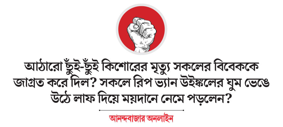 যে সমস্ত ছাত্র বা শিক্ষক সংগঠন এখন ব্যানার নিয়ে, পোস্টার নিয়ে বিশ্ববিদ্যালয়ে মিছিল করছেন, পরস্পরের বিরুদ্ধে স্লোগান তুলছেন (সেই স্লোগানেও শুনছি ‘চামড়া গুটিয়ে নেওয়ার’ হুমকি), তাঁদের কোনও দায় ছিল না? এখন যে সমস্ত ছাত্র সংগঠন ‘খুনিদের শাস্তি চাই’ বলে কলকাতা শহরের প্রায় সমস্ত সরকারি শিক্ষা প্রতিষ্ঠানে এবং রাজপথে দাপিয়ে মিছিল-মিটিং করছেন, এত দিন তাঁরা জানতেন না যাদবপুরে কী হয়? হয়ে আসছে বছরের পর বছর? এক আঠারো ছুঁই-ছুঁই কিশোরের মৃত্যু তাঁদের সকলের বিবেককে জাগ্রত করে দিল? সকলে রিপ ভ্যান উইঙ্কলের ঘুম ভেঙে উঠে লাফ দিয়ে ময়দানে নেমে পড়লেন?