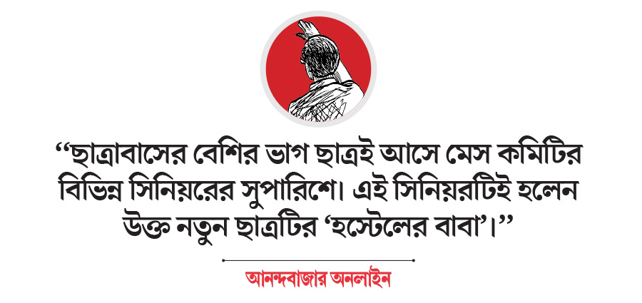 “‘হস্টেলের বাবা’ শব্দবন্ধটি আমার কাছে নতুন ছিল। জিজ্ঞাসা করে জানতে পারি, ছাত্রাবাসের বেশির ভাগ ছাত্রই আসে মেস কমিটির বিভিন্ন সিনিয়রের সুপারিশে। এই সিনিয়রটিই হলেন উক্ত নতুন ছাত্রটির ‘হস্টেলের বাবা’। এখন খুব অল্প সংখ্যক যে সকল ছাত্রের সিনিয়রদের সুপারিশ ছাড়াই স্থান হয়, আমি তার মধ্যে এক জন ছিলাম। ফলে, আমার কোনও হস্টেল-পিতা ছিল না। এর পর খাওয়াদাওয়া মিটলে, আমার রুমমেট তথা এক বছরের সিনিয়র এক ইঞ্জিনিয়ারিং-এর দাদার ওপর নির্দেশ আসে আমাকে ‘ইন্ট্রো’ সম্পর্কে বুঝিয়ে দিতে।