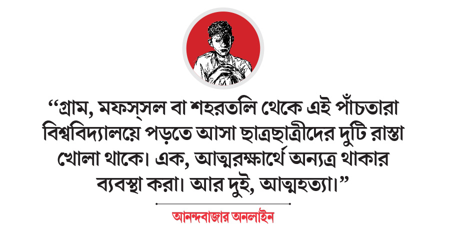 “পর দিন সন্ধ্যেবেলা আমি হস্টেল ছাড়ি এই বুঝে যে, এ সব আমার পক্ষে সহ্য করা সম্ভব হবে না। বাবার আর্থিক সঙ্গতি বিশেষ না থাকলেও যে করে হোক, যত কষ্টেই হোক, একটি মেস/পিজি খুঁজতে হবে আমায়। কসবায় একটি পিজিতে এখন থাকি আমি।”