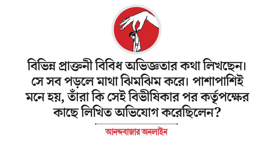 সায়নের মতোই বিভিন্ন প্রাক্তনী এখন ফেসবুকে পোস্ট করছেন তাঁদের বিবিধ অভিজ্ঞতার কথা। সে সব পড়লে, শুনলে মাথা ঝিমঝিম করে। অবসাদগ্রস্তের মতো লাগে। পাশাপাশিই মনে হয়, তাঁরা কি সেই বিভীষিকার পর কর্তৃপক্ষের কাছে লিখিত অভিযোগ নথিভুক্ত করেছিলেন? আর অবধারিত ভাবে মনে হয়— এত দিন ধরে প্রতিষ্ঠান কিছু করল না!