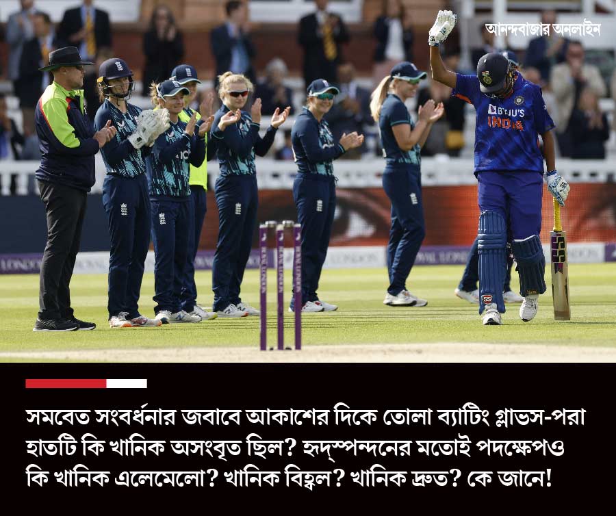 এমনই বেশ চলছিল। সব গোলমাল করে দিল গত শনিবার লর্ডসের বিকেল। জীবনের শেষ আন্তর্জাতিক ম্যাচে পৃথিবীর বিখ্যাততম প্যাভিলিয়ন থেকে বেরিয়ে মাঠে ঢুকছেন এক বঙ্গতনয়া। দু’পাশে সার দিয়ে দাঁড়িয়ে ‘গার্ড অফ অনার’ দিচ্ছে ইংল্যান্ড টিম। সায়েবসুবোয় ভরা গ্যালারি উঠে দাঁড়িয়ে হাততালি দিচ্ছে। গায়ে কাঁটা দেওয়ার মতো! মুখ দেখা যাচ্ছিল না। কিন্তু সমবেত সংবর্ধনার জবাবে আকাশের দিকে তোলা ব্যাটিং গ্লাভস-পরা হাতটি কি খানিক অসংবৃত ছিল? হৃদ্স্পন্দনের মতোই পদক্ষেপও কি খানিক এলেমেলো? খানিক বিহ্বল? খানিক দ্রুত? কে জানে!
