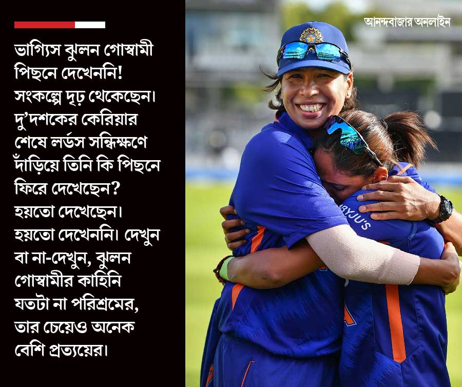 ভাগ্যিস ঝুলন গোস্বামী পিছনে দেখেননি! সংকল্পে দৃঢ় থেকেছেন। দু’দশকের কেরিয়ার শেষে লর্ডস সন্ধিক্ষণে দাঁড়িয়ে তিনি কি পিছনে ফিরে দেখেছেন? হয়তো দেখেছেন। হয়তো দেখেননি। দেখুন বা না-দেখুন, ঝুলন গোস্বামীর কাহিনি যতটা না পরিশ্রমের, তার চেয়েও অনেক বেশি প্রত্যয়ের।
