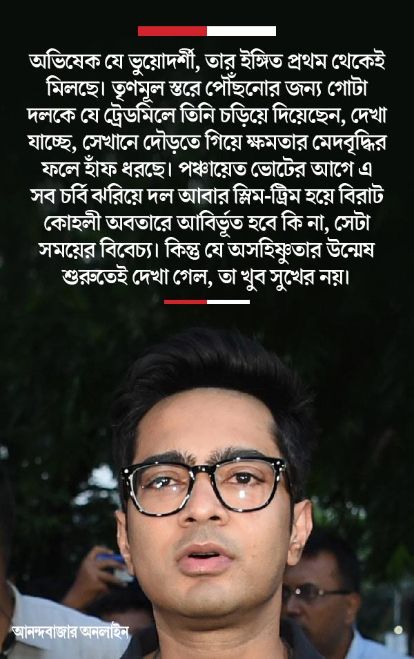 অভিষেক যে ভুয়োদর্শী, তার ইঙ্গিত প্রথম থেকেই মিলছে। তৃণমূল স্তরে পৌঁছনোর জন্য গোটা দলকে যে ট্রেডমিলে তিনি চড়িয়ে দিয়েছেন, দেখা যাচ্ছে, সেখানে দৌড়তে গিয়ে ক্ষমতার মেদবৃদ্ধির ফলে হাঁফ ধরছে। পঞ্চায়েত ভোটের আগে এ সব চর্বি ঝরিয়ে দল আবার স্লিম-ট্রিম হয়ে বিরাট কোহলী অবতারে আবির্ভূত হবে কি না, সেটা সময়ের বিবেচ্য। কিন্তু যে অসহিষ্ণুতার উন্মেষ শুরুতেই দেখা গেল, তা খুব সুখের নয়।