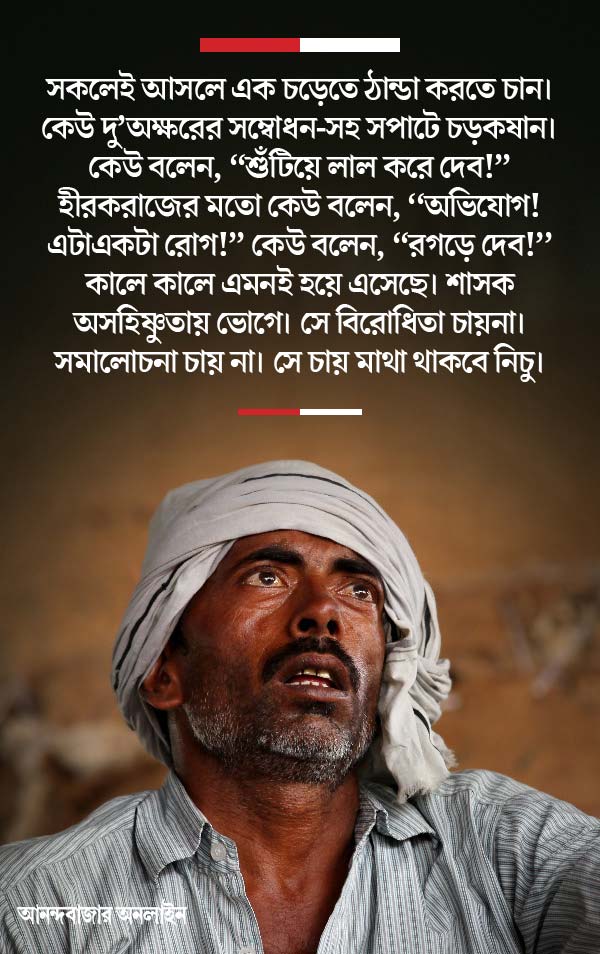 অতএব সে তর্ক থাক। অস্যার্থ হল— প্রশ্ন তুললে সকলেই আসলে এক চড়েতে ঠান্ডা করতে চান। কেউ দু’অক্ষরের সম্বোধন-সহ সপাটে চড় কষান। কেউ বলেন, ‘‘শুঁটিয়ে লাল করে দেব!’’ হীরকরাজের মতো কেউ বলেন, ‘‘অভিযোগ! এটা একটা রোগ!’’ কেউ বলেন, ‘‘রগড়ে দেব!’’ কালে কালে এমনই হয়ে এসেছে। শাসক অসহিষ্ণুতায় ভোগে। সে বিরোধিতা চায় না। সমালোচনা চায় না। সে চায় মাথা থাকবে নিচু। লেজ থাকবে দু’পায়ের ফাঁকে। যতই কেউ গান বাঁধুন, ‘বিরোধীকে বলতে দাও’, সে গান নিছক এবং নিষ্ফলা আকুতি হয়েই ক্যাসেট-সিডি-ইউটিউবে থেকে যায়। ইছাপুর সেই ইচ্ছাপূরণের বহিঃপ্রকাশ মাত্র।