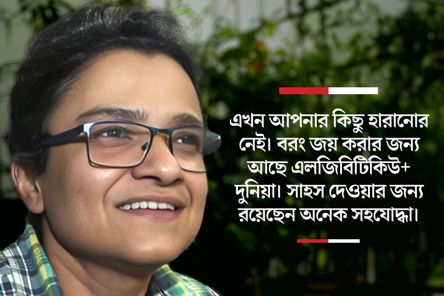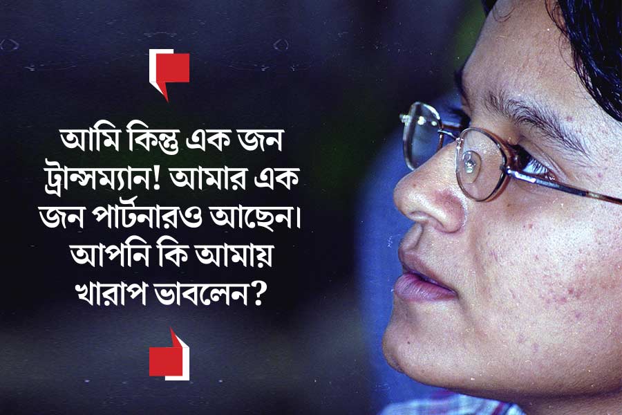 সেই কারণেই অবাক হইনি, যখন বছর দেড়েক আগে আপনি সকালে ঘুম থেকে উঠে দাঁত ব্রাশ করার মতো সহজ অনায়াসত্বে বললেন, ‘‘অনিন্দ্যবাবু, আমি কিন্তু একজন ট্রান্সম্যান! আমার এক জন পার্টনারও আছেন। আমি তাঁর সঙ্গেই থাকি। আপনি কি আমায় খারাপ ভাবলেন?’’