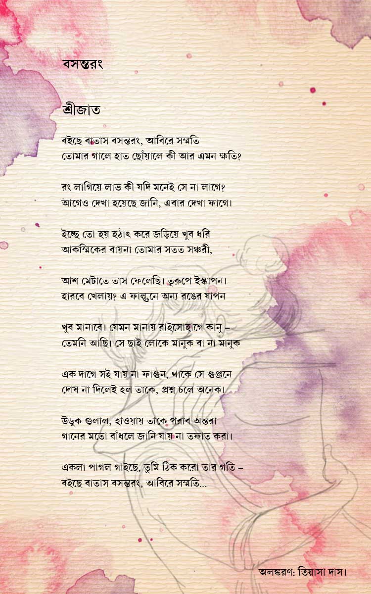 ফাগুয়ার নেশায় মাতাল প্রকৃতি। তার রূপের ডালি উজাড় করে দিয়েছে সে। চৈত্রের মাতাল হাওয়ায় মন উচাটন। পলাশের বন এলোমেলো করে পাগল হাওয়া যেন হারানো-প্রাপ্তি-নিরুদ্দেশ! সে হাওয়া পাগল করে দিয়েছে কবিকেও। শ্রীজাত-র কলমে তাই পাওয়া যায় পলাশ-শিমুল-গুলালের ঘ্রাণ। বসন্তের মন-কেমন সন্ধ্যায় শ্রীজাত তাই লিখতে পারেন, ‘ইচ্ছে তো হয় হঠাৎ করে জড়িয়ে খুব ধরি/আকস্মিকের বায়না তোমার সতত সঞ্চরী,...’