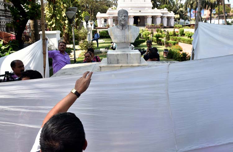 ঢেকে দেওয়া হচ্ছে শ্যামাপ্রসাদ মুখোপাধ্যায়ের ক্ষতিগ্রস্ত মূর্তি। বুধবার কেওড়াতলায়। ছবি: পিটিআই।