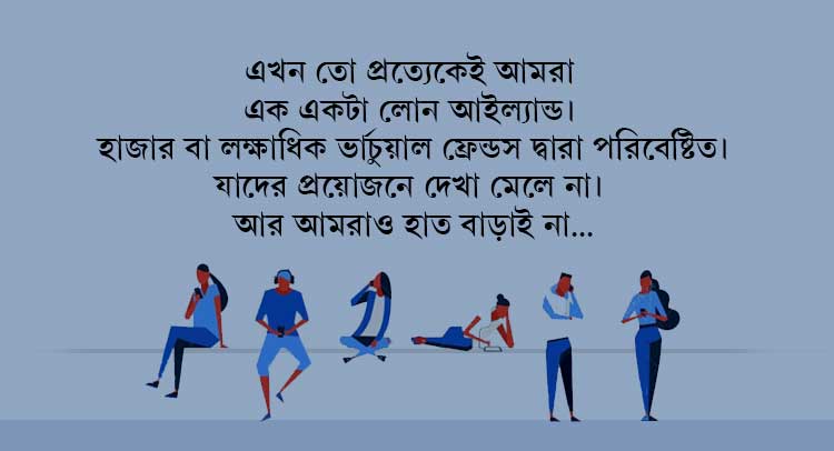 আজকের এই সোশ্যাল নেটওয়ার্কিং সাইটগুলোই কি তা হলে আমাদের ভবিষ্যতের ভূত? কই আমরা নাকি সোশ্যাল অ্যানিম্যাল? আক্ষরিক অর্থে সোশ্যাল শব্দটার সঙ্গে আপস করে সোশ্যাল নেটওয়ার্কিং সাইটগুলোতে ঢুকে কেউ পিআর করি, কেউ নিজ নিজ ফেভার ব্যাঙ্ক তৈরি করি, কেউ নিজেদের সেক্সলেস ম্যারেজটাকে অব্যাহত রেখে প্রোফাইল চেক করে সো কলড হট ফোটো এডিটেড মহিলা বা পুরুষ খুঁজি। কেউ সেলফি তুলে ক্ষান্ত হই। কেউ বা অ্যানিম্যাল ভিডিয়ো লাইক বা শেয়ার করি। নো ম্যান ক্যান লিভ অ্যাজ অ্যান আইল্যান্ড জার্নিং থ্রু লাইফ অ্যালোন... ছোটবেলায় স্কুলে শেখা এই গানটা আজ বড় খোঁচা দেয়। আসলে এখন তো প্রত্যেকেই আমরা এক একটা লোন আইল্যান্ড। হাজার বা লক্ষাধিক ভার্চুয়াল ফ্রেন্ডস দ্বারা পরিবেষ্টিত। যাদের প্রয়োজনে দেখা মেলে না। আর আমরাও হাত বাড়াই না। তাই না বন্ধু?