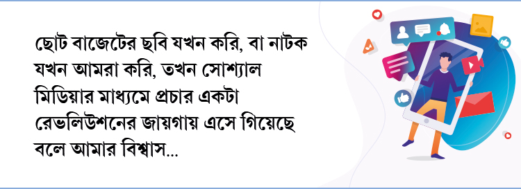 রিজিওনাল মার্কেটে ছোট বাজেটের ছবি যখন করি, বা নাটক যখন আমরা করি, তখন সোশ্যাল মিডিয়ার মাধ্যমে প্রচার একটা রেভলিউশনের জায়গায় এসে গিয়েছে বলে আমার বিশ্বাস। এমন অনেক ছোট ছোট অনুষ্ঠান, নানান ইনিশিয়েটিভ নেওয়া হয়— যেগুলো সোশ্যাল মিডিয়ায় বিজ্ঞাপন করেই কাঙ্খিত দর্শকের কাছে পৌঁছনো যাচ্ছে। যত মানুষকে আমরা পাশে চাইছি, তত জনকে পেয়ে যাচ্ছি। এগুলো তো অবশ্যই সোশ্যাল মিডিয়ামের মেরিট।