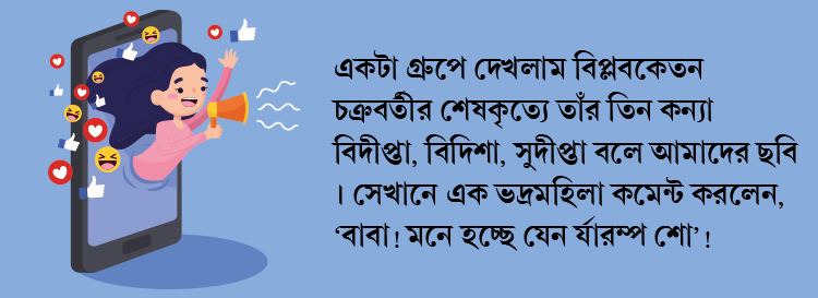 একটা ছোট্ট ঘটনার কথা বলি। গত ৩০ নভেম্বর আমার বাবা চলে গেলেন। ভোররাতে। সকালে আমার আত্মীয়রা এসে পৌঁছনোর পর আমরা শ্মশানে যাই। সেখানে বাবার শেষকৃত্য সম্পন্ন করি। বন্ধুরাও ছিল। কিছু মিডিয়ার বন্ধুও ছিল। ছবিও উঠেছিল। কয়েক দিন পরে দেখলাম সোশ্যাল মিডিয়ায় সেই সব ছবিগুলো পোস্ট হয়েছে। বেশ কিছু সিনেমা সংক্রান্ত গ্রুপ চালান অনেকে। আমার জ্ঞানত বা অজ্ঞানত সে সব গ্রুপে আমাকে অ্যাডও করে নেন। সে রকম একটা গ্রুপে দেখলাম বিপ্লবকেতন চক্রবর্তীর শেষকৃত্যে তাঁর তিন কন্যা বিদীপ্তা, বিদিশা, সুদীপ্তা বলে আমাদের ছবি। সেখানে এক ভদ্রমহিলা কমেন্ট করলেন, ‘বাবা! মনে হচ্ছে যেন র‌্যাম্প শো’!