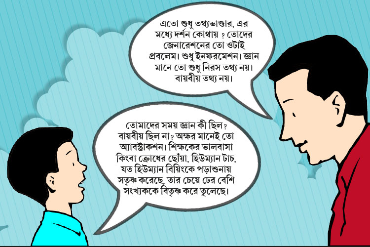 —কিন্তু এতো শুধু তথ্যভাণ্ডার, এর মধ্যে দর্শন কোথায় ? তোদের জেনারেশনের তো ওটাই প্রবলেম। শুধু ইনফরমেশন। জ্ঞান মানে তো শুধু নিরস তথ্য নয়। বায়বীয় তথ্য নয়। এই যে হিউম্যান টাচ, শিক্ষকের ভালবাসা কিংবা ক্রোধের ছোঁয়া, এ সব বাদ দিলে জ্ঞান অসম্পূর্ণ থাকে। সত্যি-মিথ্যা বিচারের ক্ষমতা বিলোপ। অ্যাতো মেকানিজম ডেভেলপ করেছে, কিন্তু ফেক আর রিয়্যালের তফাত করার মেকানিজম আজও ডেভেলপ করল না। একটা কথা সব সময় মনে রাখবি, আমাদের ইন্টারনেট বিহীন শিক্ষায় শিক্ষিত জেনারেশনই এখনও তোদের ইন্টারনেট প্রজন্মকে চালনা করছে। কী পড়বি, কী দেখবি, কী পরবি, কী খাবি, কী চড়বি... পুরো নিয়ন্ত্রণটাই আমাদের নেটহীন প্রজন্মের হাতে। যখন তোদের জেনারেশন কন্ট্রোল নেবে, তখন দেখা যাবে পৃথিবী রূপ পরিবর্তন করে কিনা।