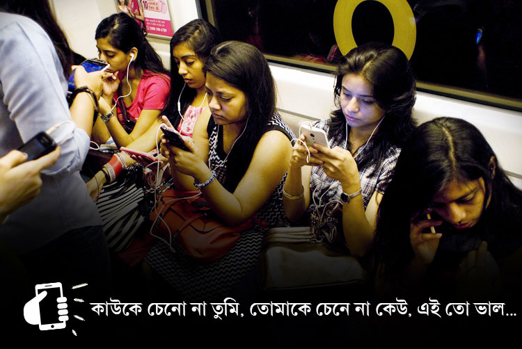 অফিস আওয়ার্সে মেট্রোয় সিট পাওয়া লটারি পাওয়ার মতো। সে দিন বেড়ালের ভাগ্য সঙ্গে ছিল। বসে পড়তে পারলেই আমার ঘুম পায়। একা একা শহরের অন্য প্রান্তে যাওয়ার সময়টা আমি ব্যবহার করি নিজের সঙ্গে কথা বলে। সেই সময়ই দৃশ্যটা চোখে পড়ল। আশেপাশের প্রায় প্রত্যেকটা লোকের হাতে মোবাইল ফোন। কথা বলছে, গান শুনছে, গেম খেলছে, চ্যাট করছে, নানাবিধ কাজে ব্যস্ত তারা। পাশের লোক, কামরা ভর্তি লোকের দিকে ফিরেও তাকাচ্ছে না।
