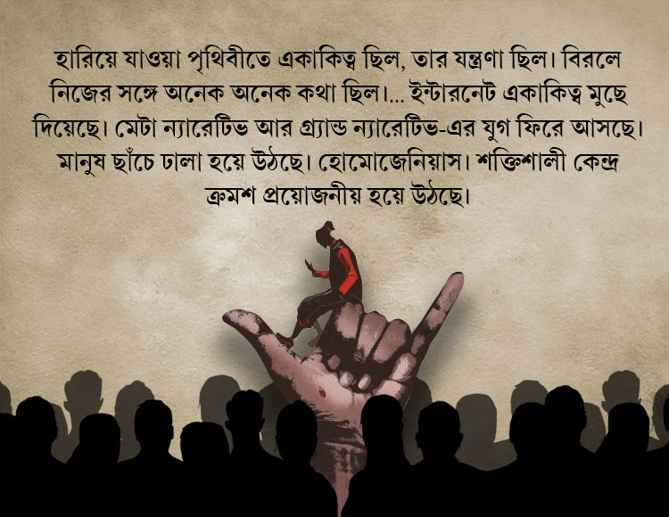 হারিয়ে যাওয়া পৃথিবীতে একাকিত্ব ছিল, তার যন্ত্রণা ছিল। বিরলে নিজের সঙ্গে অনেক অনেক কথা ছিল। ক্ষোভ অভিমান ছিল। আত্মরতি ছিল। জন্ম নিত নিজেকে বলার গল্প, নিজেকে শোনানোর কবিতা, গান। নিজেকে জানা। আর ‘আপনাকে এই জানা আমার ফুরাবে না’। ইন্টারনেট একাকিত্ব মুছে দিয়েছে। মেটা ন্যারেটিভ আর গ্র্যান্ড ন্যারেটিভ-এর যুগ ফিরে আসছে। মানুষ ছাঁচে ঢালা হয়ে উঠছে। হোমোজেনিয়াস। শক্তিশালী কেন্দ্র ক্রমশ প্রয়োজনীয় হয়ে উঠছে। সবজান্তা গুগল তথ্যভণ্ডার এনে দিয়েছে হাতের মুঠোয়। অনলাইন নজরদারিতে ব্যক্তিগত বলে আর কিছু অবশিষ্ট থাকছে না। এমন কোনও অ্যাপ বেরোয়নি, যা দিয়ে ফেক আর রিয়্যালের তফাত করা সম্ভব। সব ঝাপসা, বিচারবোধও। গড্ডলিকা প্রবাহে সমাজ চলমান। প্রত্যেকের এককবৃত্ত।