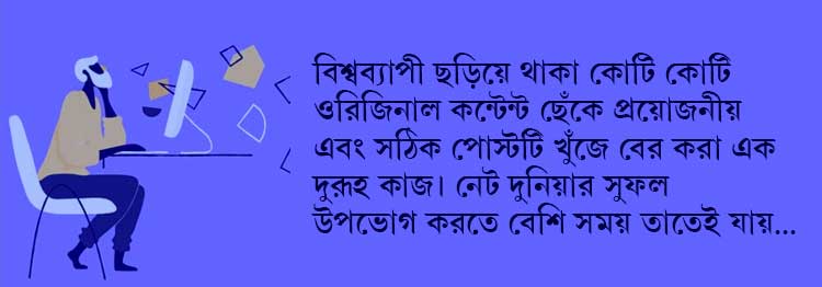 ইন্টারনেটের আশীর্বাদে পৃথিবীতে আজ সত্যিই মার্শাল ম্যাকলুহানের প্রবর্তিত গ্লোবাল ভিলেজ বা বিশ্বগ্রামের ধারণা বাস্তবতা পেয়েছে। দেশ, জাতি, ধর্ম, বর্ণ, বয়স নির্বিশেষে ইন্টারনেটের ভার্চুয়াল প্ল্যাটফর্মে যুক্ত এখন বিশ্বের এক-তৃতীয়াংশেরও বেশি মানুষ। অর্থাৎ আড়াইশ কোটি মানুষ যদি ইন্টারনেটের মাধ্যমে যুক্ত থেকে থাকেন, তবে অন্তর্জালে ভেসে বেড়াচ্ছে আড়াইশ কোটি পরিপ্রেক্ষণ। ইন্টারনেট যে স্বাধীনতার স্বাদ দিয়েছে আমাদের, তাতে আমরা এখন আর শুধুমাত্র তথ্যের উপভোক্তা হয়ে থাকতে রাজি নই, নিজেরাই কন্টেন্ট স্রষ্ঠা। বিশ্বব্যাপী ছড়িয়ে থাকা কোটি কোটি ওরিজিনাল কন্টেন্ট ছেঁকে প্রয়োজনীয় এবং সঠিক পোস্টটি খুঁজে বের করা এক দুরূহ কাজ। নেট দুনিয়ার সুফল উপভোগ করতে বেশি সময় তাতেই যায়।