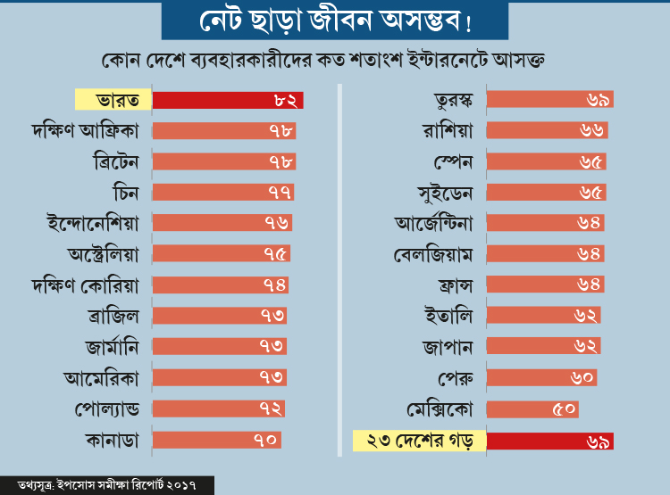 সমীক্ষার বিষয় ছিল, ইন্টারনেটে আসক্ত— এমন মানুষের শতকরা হিসাবে কোন দেশ কত নম্বরে রয়েছে। সবচেয়ে বেশি ইন্টারনেট ব্যবহারকারী ২৩টা দেশে ১৮,১৮০ জন প্রাপ্তবয়স্কের মধ্যে, ২০১৬ সালের শেষ দিকে, অনলাইনে এই সমীক্ষা চালিয়েছিল প্যারিস কেন্দ্রিক গ্লোবাল মার্কেট রিসার্চ সংস্থা ইপসোস (Ipsos)।