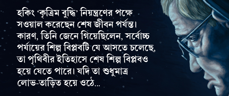 স্টিফেন হকিং ‘কৃত্রিম বুদ্ধি’ নিয়ন্ত্রণের পক্ষে সওয়াল করেছেন শেষ জীবন তক। কারণ, তিনি জেনে গিয়েছিলেন, সর্বোচ্চ পর্যায়ের যে শিল্প বিপ্লবটি আসতে চলেছে, তা পৃথিবীর ইতিহাসে শেষ শিল্প বিপ্লবও হয়ে যেতে পারে। যদি তা শুধুমাত্র লোভ-তাড়িত হয়ে ওঠে।