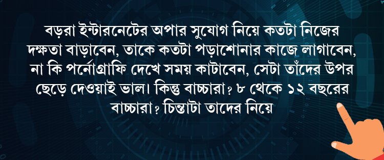 বড়রা ইন্টারনেট বিচার বিবেচনা করে ব্যবহার করবেন, এটা আশা করা যায়। তাঁরা ইন্টারনেটের অপার সুযোগ নিয়ে কতটা নিজের দক্ষতা বাড়াবেন, তাকে কতটা পড়াশোনার কাজে লাগাবেন, না কি পর্নোগ্রাফি দেখে সময় কাটাবেন, সেটা তাঁদের উপর ছেড়ে দেওয়াই ভাল। কিন্তু বাচ্চারা? ৮ থেকে ১২ বছরের বাচ্চারা? চিন্তাটা তাদের নিয়ে। দেখা যাচ্ছে, ২০২০ সালের মধ্যে কম করে ৪০ কোটি বাচ্চা ইন্টারনেটের মাধ্যমে বিপদের সম্মুখীন হতে চলেছে। এই আসন্ন বিপদকে চিহ্নিত করা হচ্ছে সাইবার মহামারি হিসাবে।