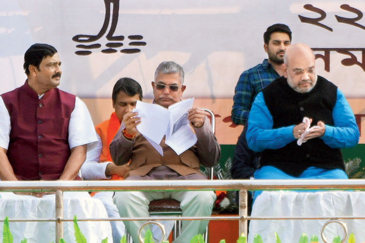 দিলীপ ঘোষ, রাহুল সিংহের সঙ্গে মঞ্চে অমিত শাহ।