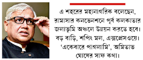 আমাদের তথাকথিত সাংস্কৃতিক রাজধানীটি অবশ্য অন্য রকম। কিছু দিন আগে এ শহরের মহানাগরিক বলেছেন, রামাসার কনভেনশনে পূর্ব কলকাতার জলাভূমি সংরক্ষণের কথা বলা হলেও তাঁর এ ব্যাপারে সংশয় আছে। ওই অঞ্চলে উন্নয়ন করতে হবে। বড় বাড়ি, শপিং মল, এক্সপ্রেসওয়ে। ‘একেবারে পাগলামি’, অমিতাভের সাফ কথা। কিন্তু, একই সঙ্গে তিনি খেয়াল করিয়ে দেন, ‘‘কলকাতা একা এই উন্মত্ত ডিরেঞ্জমেন্টের শিকার নয়। পৃথিবীর সব শহরে এখন বিল্ডার লবিই শক্তিশালী। চেন্নাইতে অত বন্যার পরেও আডেয়ার নদী আর সমুদ্রের মাঝে বিশাল এক হাউজিং কমপ্লেক্স উঠছে। মায়ামি বিচ-এও এক অবস্থা।’’ তাঁর বক্তব্য, প্রকৃতিকে অস্বীকার করে ঘরবাড়ি তৈরির পাগলামি (বা উন্নয়ন) সারা পৃথিবীতেই। এখন সংস্কৃতির অন্যতম দায়িত্ব, এই মডেলটিকে প্রশ্নে প্রশ্নে বিদ্ধ করা।