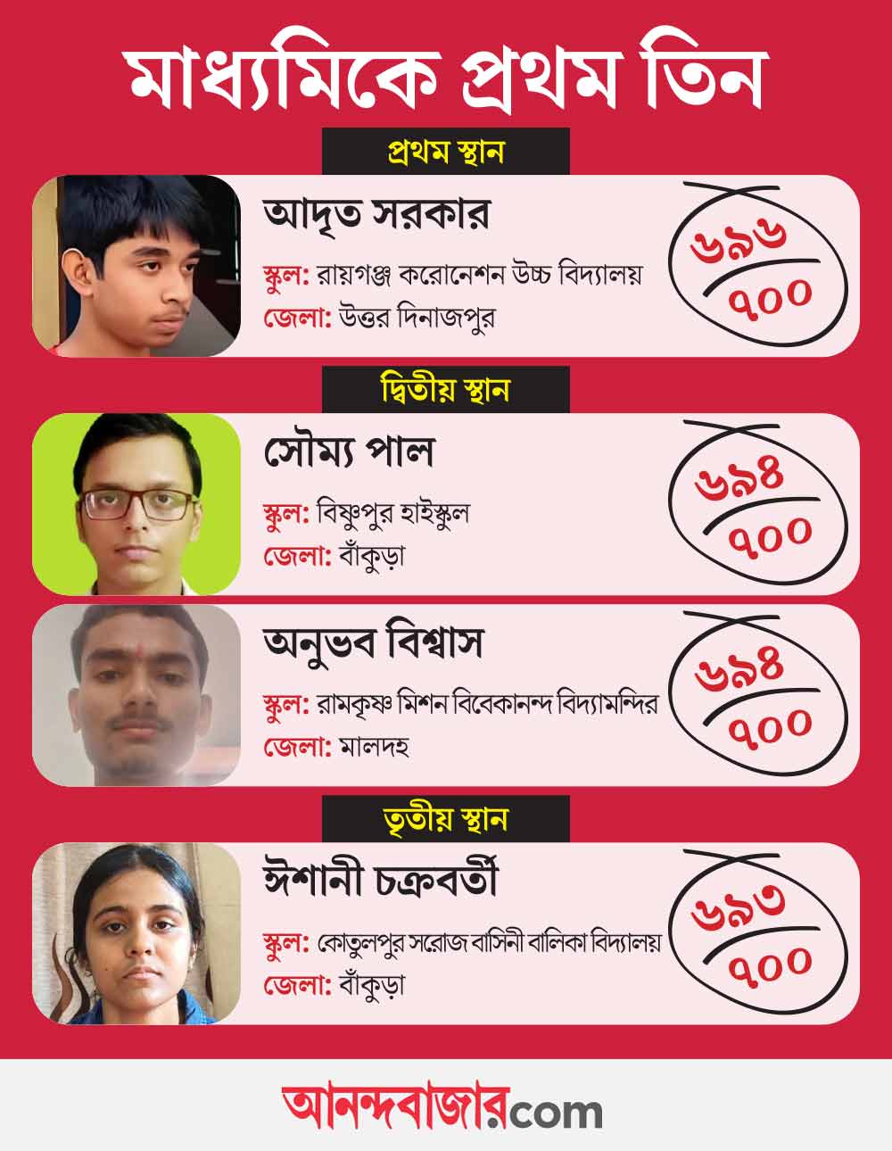মালদহের ইংরেজবাজারের বাসিন্দা অনুভব বিশ্বাস। রামকৃষ্ণ মিশন বিবেকানন্দ বিদ্যামন্দির থেকে মাধ্যমিকে উত্তীর্ণ হয়েছে। অন্য দিকে, বাঁকুড়ার বিষ্ণুপুর হাই স্কুল থেকে মাধ্যমিক পাশ করেছে সৌম্য পাল। দু’জনেরই বক্তব্য, ভাল ফলের আশা থাকলেও দ্বিতীয় হবে, ভাবেনি। তাই উচ্ছ্বসিত দু’জনেই।