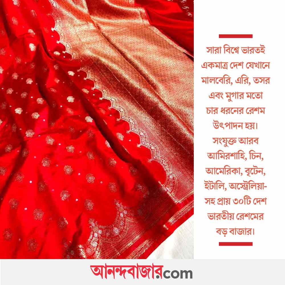 এই মুহূর্তে রেশম উৎপাদনে সারা বিশ্বে দ্বিতীয় ভারত। ২০২৫ অর্থবর্ষে রেশম সুতো ও বস্ত্র রফতানি করে প্রায় ২৪.৬ কোটি ডলার রোজগার করেছে দেশ। এ ক্ষেত্রে ভারতের সব থেকে বড় ক্রেতা হল সংযুক্ত আরব আমিরশাহি। তার পরেই রয়েছে চিন এবং আমেরিকা।
