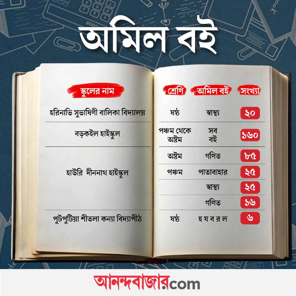 দক্ষিণ ২৪ পরগনার বিভিন্ন স্কুলের বিভিন্ন বিষয়ের বই পৌঁছায়নি ১৬ মার্চও। কৃষ্ণচন্দ্রপুর হাইস্কুলের প্রধান শিক্ষক চন্দন মাইতি বলেন, “ষষ্ঠ শ্রেণির পড়ুয়ারা এখনও ভূগোল বই পায়নি। সোমবার সকালে ফোন করে আশ্বাস দেওয়া হয়েছে। কিন্তু খুব দ্রুত হলেও ওই বই পড়ুয়ারা পাবে মঙ্গলবার, ১৭ মার্চ। তার আগে নয়। এ দিকে এপ্রিল থেকে পরীক্ষা। কী করে পরীক্ষা দেবে ওরা?”