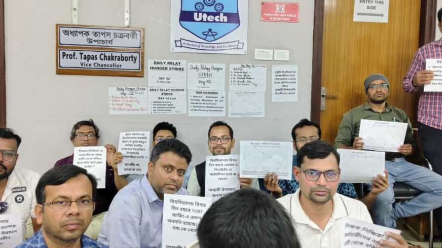 মৌলানা আবুল কালাম আজ়াদ প্রযুক্তি বিশ্ববিদ্যালয়ে (ম্যাকাউট) পূর্ণ সময়ের চুক্তিভিত্তিক শিক্ষকদের অনশন দু’দিনে পড়ল। দাবি আদায়ে শুক্রবারও একই ভাবে আন্দোলন চালিয়ে যাচ্ছেন শিক্ষকদের একাংশ। বৃহস্পতিবার থেকে উপাচার্যের ঘরের সামনে পর্যায়ক্রমে অনশন শুরু করেন। শুক্রবার পর্যন্ত তাঁদের সঙ্গে কর্তৃপক্ষের তরফে যোগাযোগ করা হয়নি বলে জানান আন্দোলনকারী শিক্ষকেরা। তৃণমূল শিক্ষক সংগঠন ওয়েবকুপার ম্যাকাউট শাখার সভাপতি তোতন ঘোষ জানান, এ দিন সমস্ত পূর্ণসময়ের শিক্ষক এবং শিক্ষাকর্মীদের কাছে তাঁদের পাশে থাকার জন্য আহ্বান জানানো হয়েছে। তবে পঠনপাঠনে কোনও প্রভাব পড়েনি বলেই দাবি তাঁর।