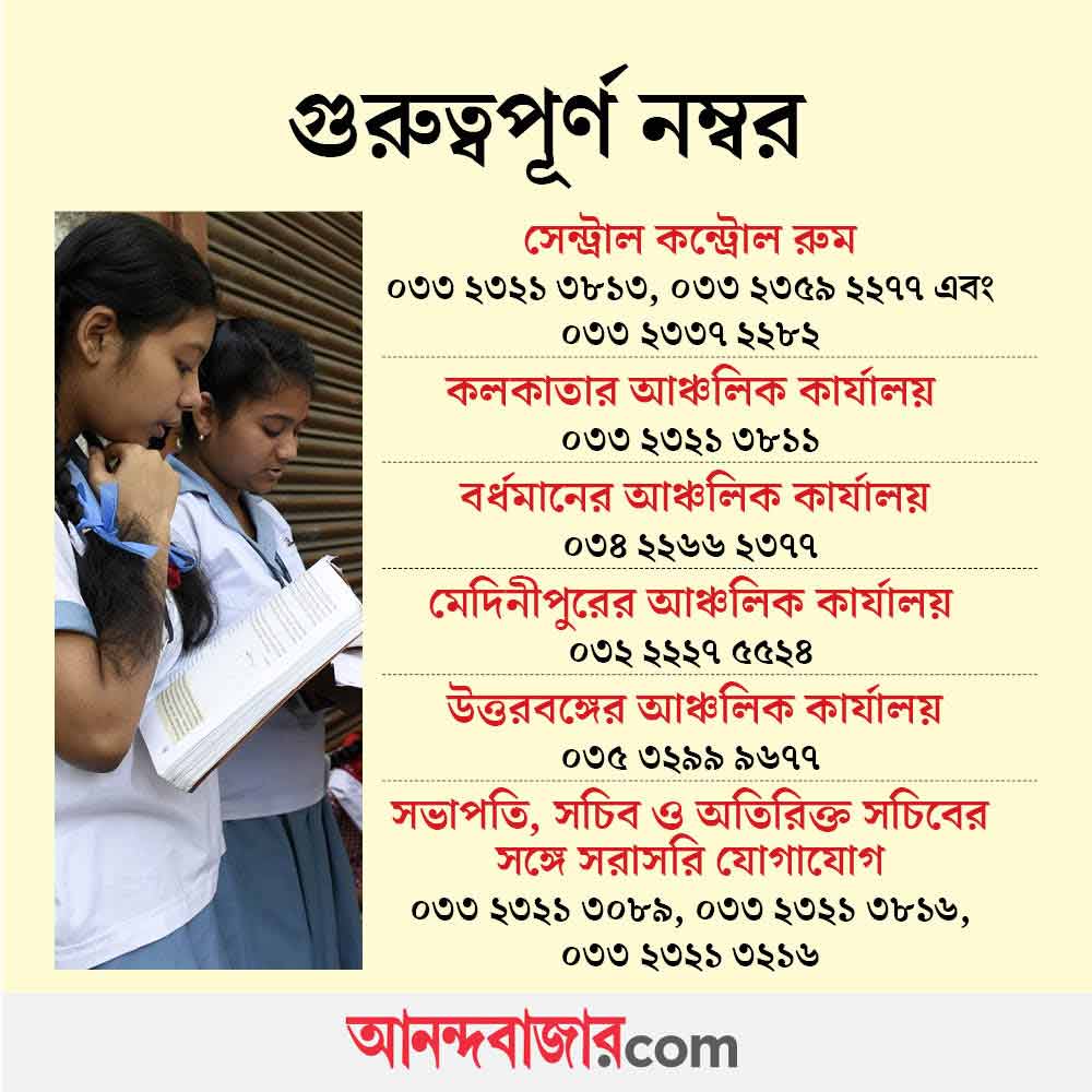 পর্ষদের দাবি, এই নির্দেশিকা জারি করা হয়েছে পরীক্ষার স্বচ্ছতার স্বার্থে। পাশাপাশি, পরীক্ষা ব্যবস্থা সুষ্ঠু ভাবে পরিচালনার জন্য হেল্পলাইন নম্বর চালু করেছে মধ্যশিক্ষা পর্ষদ। যা সচল থাকবে ২৪ ঘণ্টাই। সেন্ট্রাল কন্ট্রোল রুমে যে নম্বরগুলির মাধ্যমে যোগাযোগ করা যাবে, সেগুলি হল— ০৩৩ ২৩২১ ৩৮১৩, ০৩৩ ২৩৫৯ ২২৭৭ এবং ০৩৩ ২৩৩৭ ২২৮২। পর্ষদের কন্ট্রোল রুমের কলকাতার আঞ্চলিক অফিসে ০৩৩ ২৩২১ ৩৮১১, বর্ধমানের আঞ্চলিক অফিসে ০৩৪ ২২৬৬ ২৩৭৭, মেদিনীপুরের আঞ্চলিক অফিসে ০৩২ ২২২৭ ৫৫২৪ এবং উত্তরবঙ্গের আঞ্চলিক অফিসে ০৩৫ ৩২৯৯ ৯৬৭৭ নম্বরের মাধ্যমে যোগাযোগ করা যাবে। এ ছাড়াও খুবই গুরুত্বপূর্ণ প্রয়োজন হিসাবে আরও তিনটি নম্বর দেওয়া হয়েছে— ০৩৩ ২৩২১ ৩০৮৯, ০৩৩ ২৩২১ ৩৮১৬, ০৩৩ ২৩২১ ৩২১৬। এই নম্বরগুলিতে সভাপতি, সচিব ও অতিরিক্ত সচিবের সঙ্গে সরাসরি যোগাযোগ করা যাবে জানানো হয়েছে। পরীক্ষার্থী, শিক্ষক-শিক্ষিকা এবং অভিভাবকেরা সংশ্লিষ্ট নম্বরগুলিতে যোগাযোগ করে পরীক্ষা সংক্রান্ত বিষয়ে সমস্ত সহযোগিতা পাবেন বলে জানিয়েছে পর্ষদ।