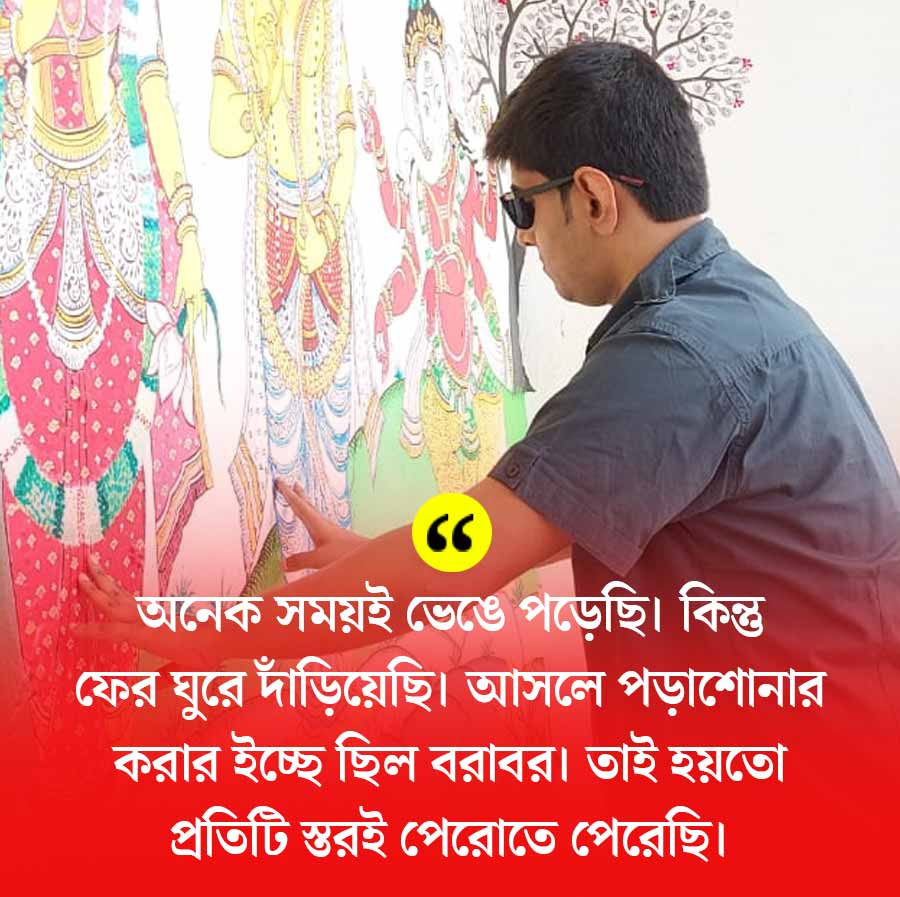 ঈশান: হ্যাঁ সমস্যা তো হয়েছেই। দৃষ্টিহীনতার থেকেও বেশি সমস্যা হয়েছে পারিপার্শ্বিক পরিস্থিতি নিয়ে। অনেক সময়ই ভেঙে পড়েছি। কিন্তু ফের ঘুরে দাঁড়িয়েছি। আসলে পড়াশোনার করার ইচ্ছে ছিল বরাবর। তাই হয়তো প্রতিটি স্তরই পেরোতে পেরেছি। দশম-দ্বাদশের সময় খানিকটা দৃষ্টিশক্তি ছিল। ওই পরীক্ষাগুলি দিয়েছি নিজে লিখেই। পরবর্তীকালে ‘রাইটার’ নিতে হয়েছে।