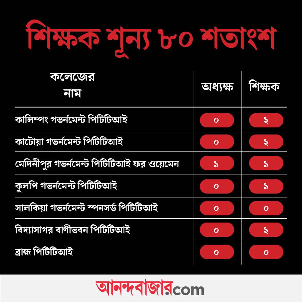 স্কুলশিক্ষা সূত্রের খবর, রাজ্যে মোট ৪২টি শিক্ষকশিক্ষণ কলেজে রয়েছে। সেখানে দীর্ঘদিন কোনও নিয়োগ নেই। উত্তরবঙ্গের কালিম্পং, জলপাইগুড়ি, বীরভূম, কাটোয়া, কৃষ্ণনগর, বর্ধমান, দক্ষিণ ২৪ পরগনার প্রায় ৪২ টি কলেজের মধ্যে ৩৬টি কলেজেই অধ্যক্ষ পদ শূন্য। ভারপ্রাপ্ত শিক্ষক দিয়েই কোনও ভাবে কাজ চলছে। এ ছাড়া, যেখানে অধ্যক্ষ-সহ ৩৩৬ জন শিক্ষক থাকার কথা সেখানে বর্তমানে রয়েছে মাত্র ৭০ জন। অর্থাৎ ঘাটতি প্রায় ৮০ শতাংশ।