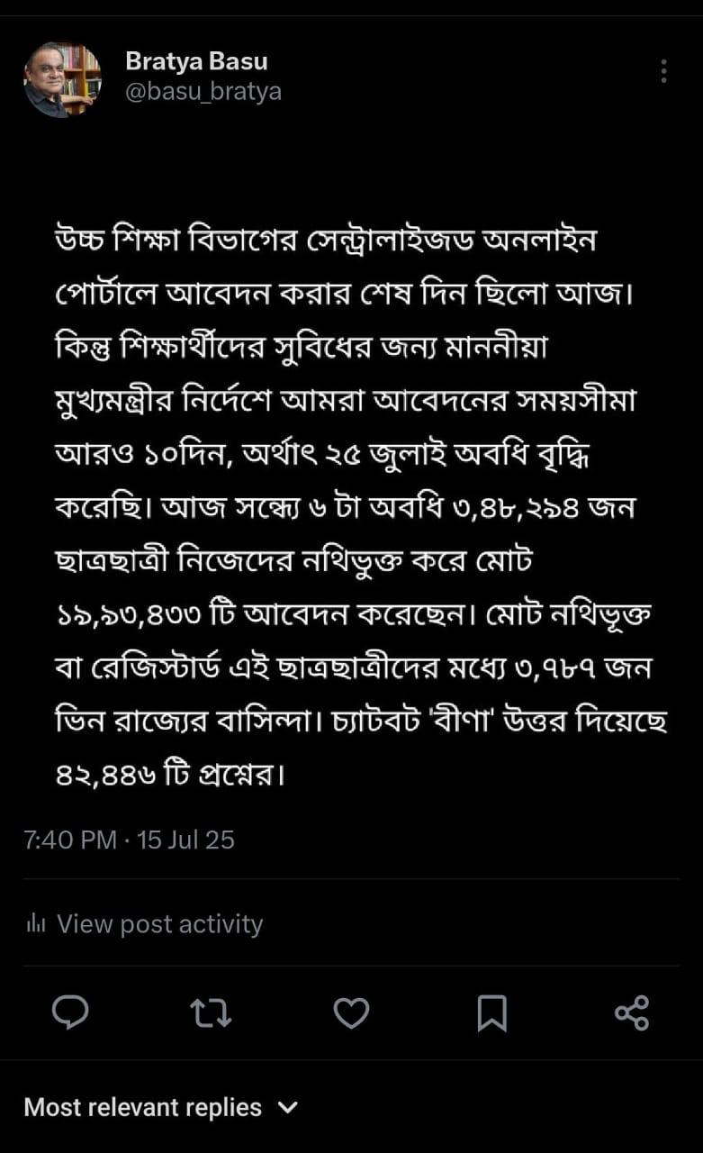 বিকেল ৬ টা পর্যন্ত অভিন্ন পোর্টালের মাধ্যমে আবেদনের সংখ্যা ১৯ লক্ষ ৯৩ হাজার ৪৪৩। আবেদনকারী পড়ুয়ার সংখ্যা ৩ লক্ষ ৪৮ হাজার ২৯৪। ভিন্ রাজ্য থেকে ৩৭৮৭ জন আবেদন করেছেন বলে শিক্ষামন্ত্রী জানিয়েছেন। নিজের এক্স্যা হ্যান্ডেলে তিনি লিখেছেন।