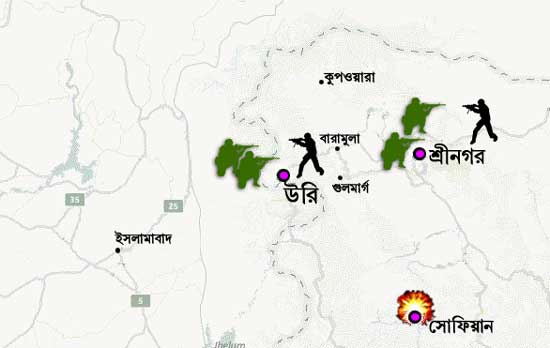 সেনা সূত্রে খবর, এ দিন রাত ৩টে নাগাদ উত্তর কাশ্মীরের বারামুলার কাছে নিয়ন্ত্রণরেখা পেরিয়ে ঢুকে পড়ে পাঁচ-ছয় জন জঙ্গির একটি দল। উরি সেক্টরের ৩১ নম্বর রেজিমেন্টের মোহরা ক্যাম্প লক্ষ করে গুলি ছুড়তে করে তারা। পাল্টা জবাব দেয় সেনারাও। এক সেনা আধিকারিকের কথায়, আরও জঙ্গির লুকিয়ে থাকার আশঙ্কায় তল্লাশি অভিযান শুরু হয়েছে। পাক অধিকৃত কাশ্মীরের উপত্যকা পেরিয়েই এই জঙ্গি দলটি ভারতে অনুপ্রবেশ করেছে বলে প্রাথমিক ভাবে মনে করছেন সেনারা। জম্মু-কাশ্মীরের মুখ্যমন্ত্রী ওমর আবদুল্লা টুইটারে জানিয়েছেন, “রাজ্যের শান্তি-শৃঙ্খলা ভঙ্গ করতে মরিয়া আক্রমণ চালাচ্ছে জঙ্গিরা।”