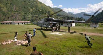 ত্রাণ নিয়ে যাওয়া হচ্ছে হেলিকপ্টারে। ছবি: রয়টার্স।
