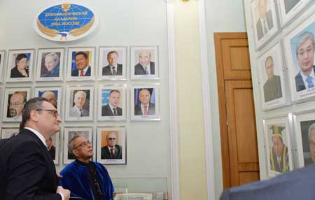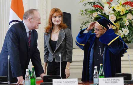 তবে বিদেশ মন্ত্রক জানাচ্ছে, এ ক্ষেত্রে অনুঘটকের ভূমিকা নিয়েছেন স্বয়ং রাষ্ট্রপতি প্রণব মুখোপাধ্যায়। ‘উপ মহাদেশে শান্তি কায়েম রাখা ও ভারত-রাশিয়ার বন্ধুত্বের সম্পর্ক এগিয়ে নিয়ে যাওয়ার অন্যতম কাণ্ডারি হিসাবে’ রাশিয়ার ডিপ্লোম্যাটিক আকাদেমি শুক্রবার আনুষ্ঠানিক ভাবে প্রণববাবুকে ডক্টরেট সম্মানে সম্মানিত করেন। প্রণববাবুই প্রথম কোনও ভারতীয় যাঁকে এই মর্যাদা দিল ক্রেমলিন। ঢাকা ও কলকাতা বিশ্ববিদ্যালয়ের পর এই নিয়ে তৃতীয় কোনও প্রতিষ্ঠান থেকে ডক্টরেট ডিগ্রি গ্রহণ করলেন প্রণব। (যদিও এ ধরনের বহু অনুরোধ তিনি সাম্প্রতিক কালে ফিরিয়ে দিয়েছেন।) পরে মস্কো স্টেট ইউনিভার্সিটিতে এক আলোচনাচক্রে অংশ নেন রাষ্ট্রপতি। তাঁর কথায়, ‘‘ভারতের রাষ্ট্রপতি প্রশাসনিক প্রধান নন। তাই প্রশাসনিক সিদ্ধান্ত নেওয়ার ক্ষমতা তাঁর নেই। কিন্তু রাষ্ট্রপতি পদের দায়িত্ব নেওয়ার পর থেকেই আমি কেন্দ্রীয় বিশ্ববিদ্যালয়গুলির মানোন্নয়নের চেষ্টা করছি।’’ বিদেশ সচিব জয়শঙ্কর বলেন, শুধু কথায় নয়, তা কাজেও করে দেখাচ্ছেন রাষ্ট্রপতি। ইদানিং কালে তাঁর সব ক’টি বিদেশ সফরে দেশের প্রযুক্তি ও বিজ্ঞান গবেষণা কেন্দ্রের প্রতিনিধিদের নিয়ে সফর করেছেন। তাঁর উদ্যোগে বিভিন্ন রাষ্ট্রের সঙ্গে শিক্ষাক্ষেত্রে দ্বিপাক্ষিক সহযোগিতার পথে পা বাড়াচ্ছে নয়াদিল্লি। ভবিষ্যৎ ভারত ও নতুন প্রজন্মের জন্য যে পদক্ষেপ খুবই ইতিবাচক।