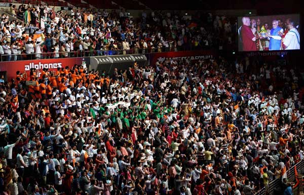 মোদীর অপেক্ষায় তখন প্রহর গুনছে গোটা অলফোনস আরেনা। তিনি এলেন। পরনে সাদা জামা, উপরে নীলরঙা হাফ-জ্যাকেট। তাঁকে দেখামাত্রই মোদী...মোদী ধ্বনিতে মুখরিত হয়ে উঠল আরেনা। স্থানীয় সময় তখন সন্ধে ৬টা। মঞ্চে একে একে হাজির হলেন সে দেশের রাজনীতিবিদ থেকে ক্রিকেটাররা। শেষ নামটা সঞ্চালক উচ্চারণ করতেই গোটা আরেনায় উচ্ছ্বাসের বন্যা বয়ে যায়। মঞ্চে উঠেই স্বকীয় ভঙ্গিতে প্রবাসী ভারতীয়দের মোদী সম্বোধন করেন ‘মেরে পেয়ারে দেশবাসী’ বলে। আরেনার পরিবেশ তখন যেন এক টুকরো ভারত!