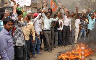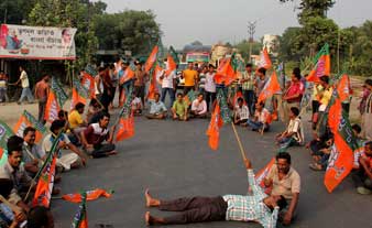 সিউড়ির রাস্তায় বিজেপির বিক্ষোভ। ছবি: তাপস বন্দ্যোপাধ্যায়।