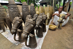 সোনালি ধাতুর সুতোয় তৈরি শিল্পকৃতি ডোকরা। বাঁকুড়া শহর-লাগোয়া বিকনায় ছোট্ট পাড়াটার নামই হয়ে গিয়েছে ‘ডোকরা গ্রাম’। ঘরে ঘরে রাষ্ট্রপতি, রাজ্যপালের শংসাপত্র, পুরস্কার। তাতে কষ্ট ঘোচেনি শিল্পীদের। তামা, পিতল, পিচ ও রজনের মতো কাঁচামালের দাম বেড়ে গিয়েছে অনেক গুণ। কাঁসার পুরনো বাসনও এখন সে ভাবে মেলে না। পাঁচ ইঞ্চির একটি শিল্পকৃতি তৈরি করতে ২০০ টাকার খরচ, সঙ্গে পরিশ্রম। কিন্তু ব্যবসায়ী তা ৩০০ টাকা দরে কেনেন। সেই জিনিসই বাজারে ৫০০-৬০০ টাকা দামে বিক্রি হচ্ছে। শিল্পী ধীরেন কর্মকার, শৈলেন কর্মকারদের আক্ষেপ, ‘‘ক্রেতারা শিল্পের বেশি দাম দিতে চাইছেন না।’’