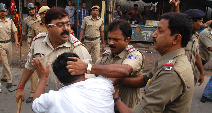 বনধ সমর্থনকারী এবং পুলিশের বচসা। আসানসোলে শৈলেন সরকারের তোলা ছবি।