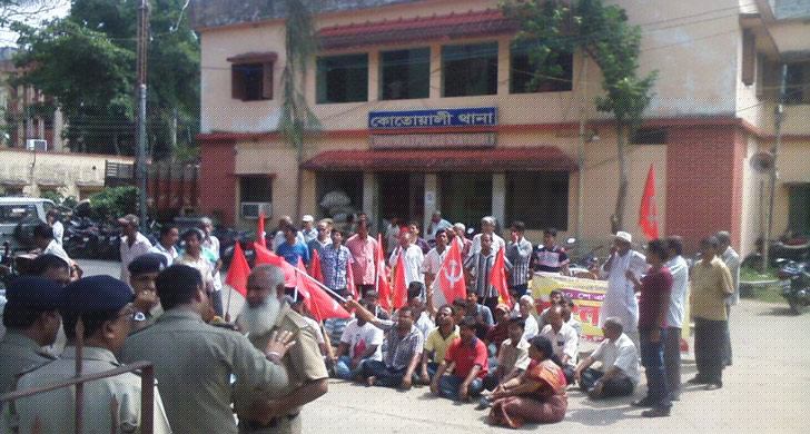 কৃষ্ণনগরে থানার সামনে বনধ সমর্থনকারীদের অবস্থান বিক্ষোভ। ছবি: সুদীপ ভট্টাচার্য।