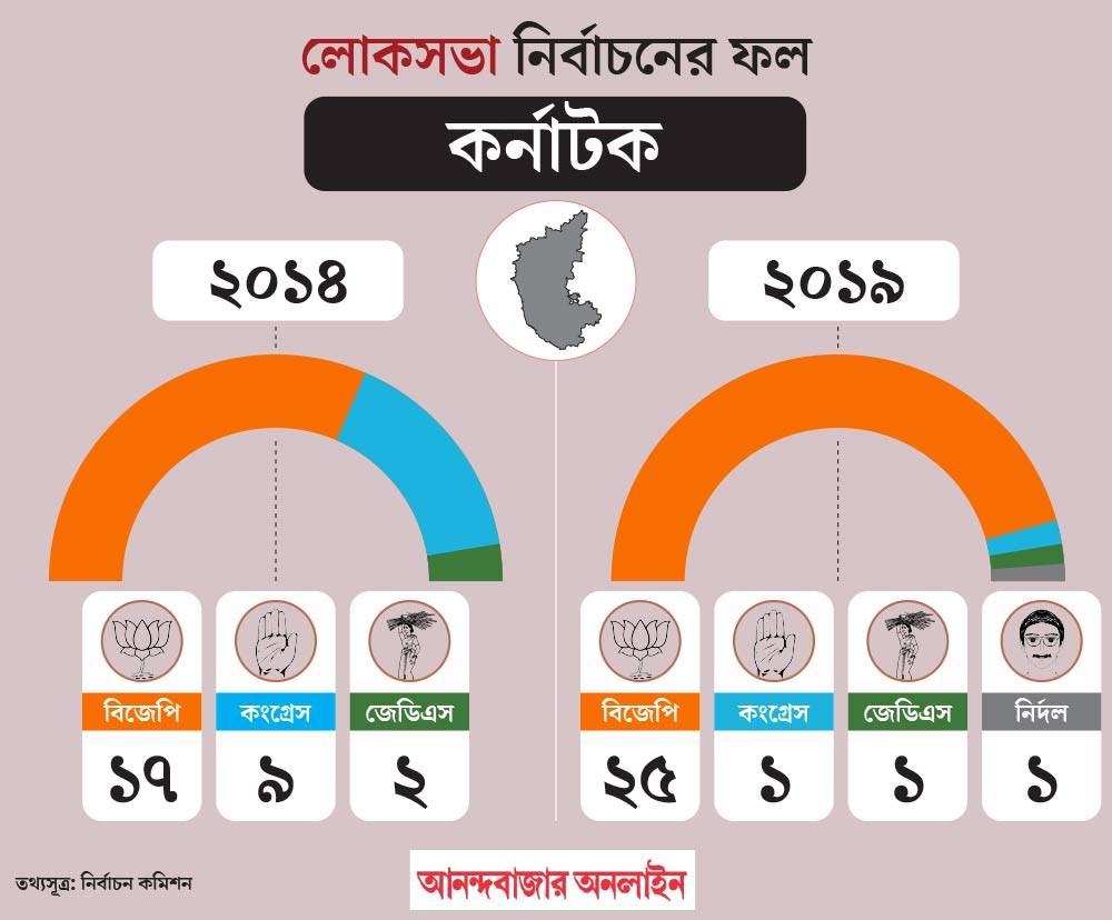 ওই দুই ঘটনাকে ‘হাতিয়ার’ করেই ভোট বৈতরণী পার করেছিল বিজেপি। সারা দেশে একাই পেয়েছিল ৩০৩টি আসন। তখনও কর্নাটক এবং তেলঙ্গানা ছাড়া দক্ষিণের আর কোনও রাজ্যে তেমন ছাপ ফেলতে পারেনি বিজেপি। তেলঙ্গানায় বিজেপি পেয়েছিল চারটি আসন। তাদের ‘দাক্ষিণাত্য বিজয়’-এর স্বপ্ন অধরাই থেকে গিয়েছিল। সেই স্বপ্নপূরণের অন্যতম চাবিকাঠি কর্নাটক ধরে রাখাই ছিল বিজেপির চ্যালেঞ্জ। আগের নির্বাচনের মতো সফল না হলেও রাজ্যে তারা ১৭টি আসনে জয়ী। জেডিএসের কাছে এ বারের লোকসভা ভোট ছিল অস্তিত্ব রক্ষার। আর কর্নাটকের কংগ্রেস সরকারের কাছে এ বারের নির্বাচন ছিল মর্যাদা কায়েমের। কংগ্রেস তাতে অনেকটাই সফল। গত বারের তুলনায় অনেকটাই বৃদ্ধি পেয়েছে আসন সংখ্যা, যেমন হয়েছে বাকি দেশে।